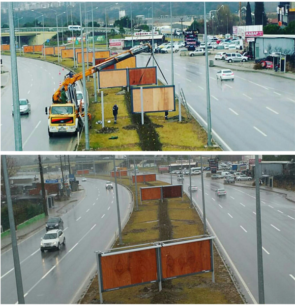 Büyükşehir Belediyesi’nin attığı adımı yine Zerrin Kamir duyurdu. Orta refüjü pano tarlasına çeviren bilbordların çoğunun söküldüğünü, yalnızca 5 bilbord bırakıldığını Kamir’in fotoğrafında gördük.