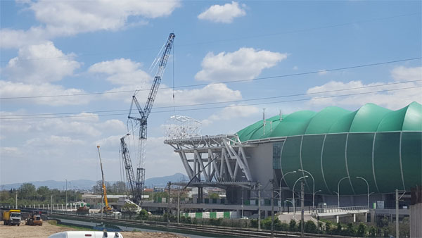 Timsah Arena önüne bir süre önce konan vinçlerin harekete geçmeleri ve timsahın kafası montajına başlanması heyecan vericiydi.