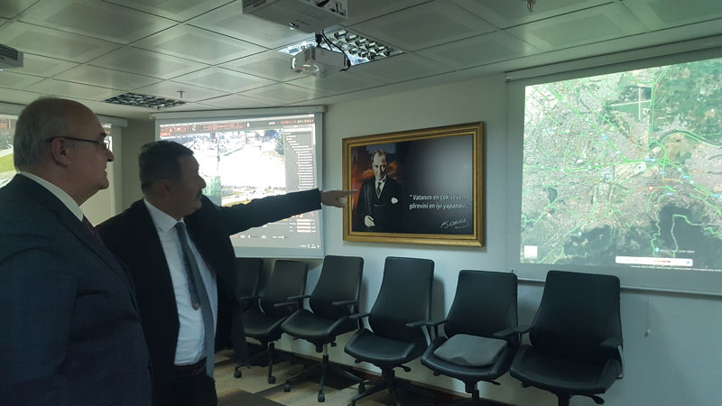 Makam odasının arkasında… Kenti izleyen tüm kamera görüntülerini gece yarılarına kadar izlediği ve dijital karargâh haline getirdiği salondaki duvarda kentin tümündeki trafik akışını anında gösteren elektronik bir pano da var.