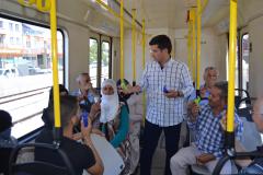 Bursaray’ın Doğu Hattı’nda Arabayatağı-Kestel arası yolcu taşıyan eski vagonlara dikkat çekmek için farklı bir yol izledi. Bu vagonların yaz günlerinde sıcaktan alev odası haline dönüştüğünü göstermek amacıyla, yolculara serinlemeleri için avuç içi pervane dağıttı.