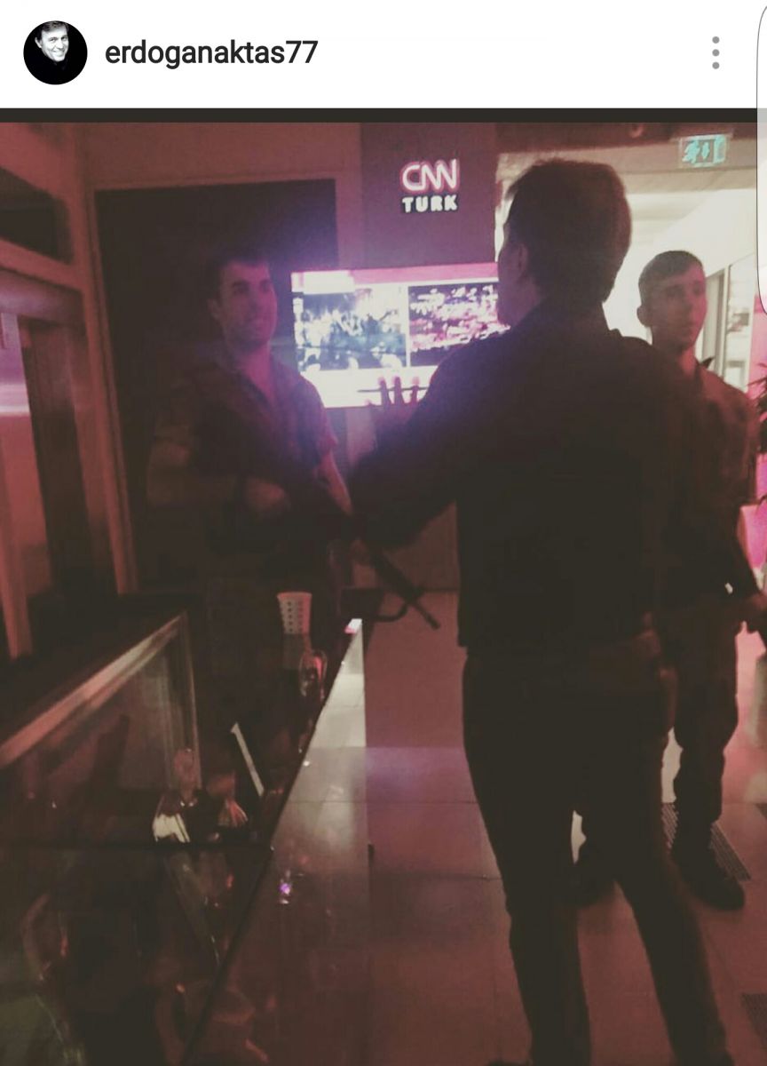 CNN Türk Genel Müdürü Erdoğan Aktaş soğukkanlılıkla çalışanları dışarı çıkarıp ortalığı yatıştırdı. Bunlar olurken, askerlerin kesildiğini sandıkları yayın devam etti ve konuşmaları herkes duydu.
