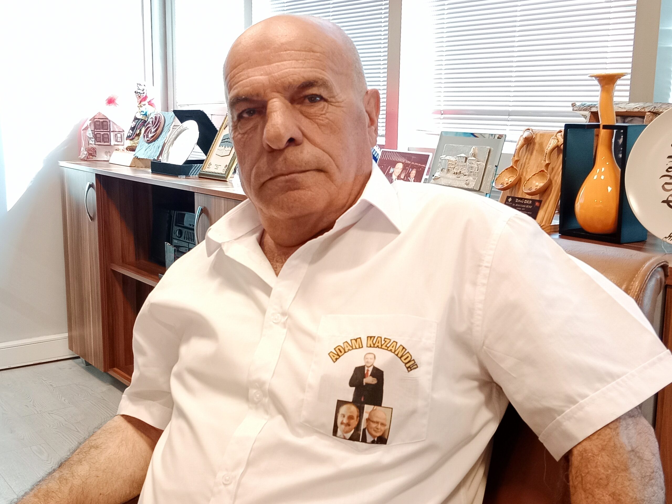 Ziyarete geldiğinde gömleğinde Adam Kazandı yazısı ve 3 fotoğraf dikkatimizi çekti: Recep Tayyip Erdoğan, Mustafa Varank, Davut Gürkan.