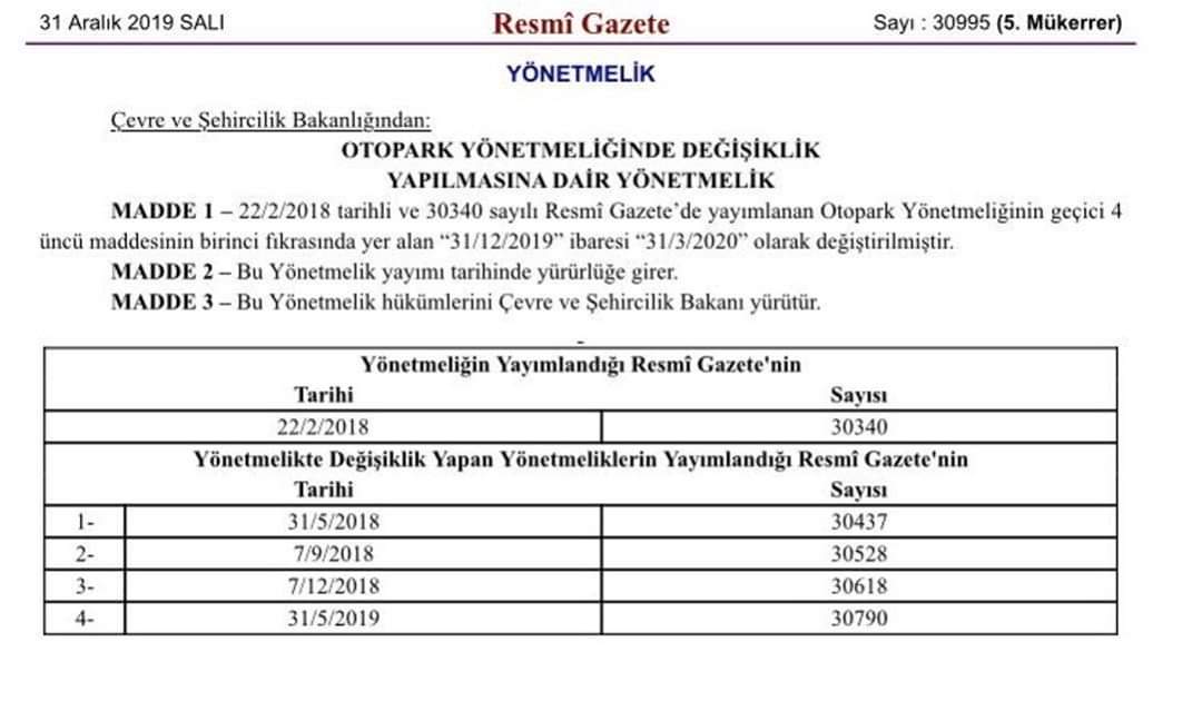 22.02.2008’de hazırlanan ve binalara zorunlu otopark getiren yönetmelikse Çevre ve Şehircilik Bakanlığı tarafından 6. kez ertelenip 31.03.2020’ye bırakıldı. Karar yılın son günü Resmi Gazete’de yayınlandı.