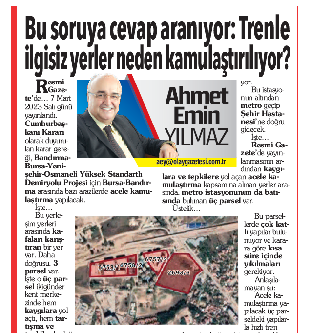 “9 Mart 2023 tarihli Olay Gazetesi’ndeki köşe yazısında Bursa ili, Nilüfer ilçesi, Balat mahallesinde bulunan, 6757 ada, 1 ve 2 nolu parseller; 6758 ada, 1 ve 2 nolu parseller ile 7253 ada, 1 ve 2 nolu parseller habere konu edilerek, acele kamulaştırmaya konu olan taşınmazlarda bulunan binaların kısa zamanda boşaltılarak yıkılacağı belirtilmiş ve kamulaştırma işleminin ne maksatla kimin için yapıldığı sorgulanmıştır.”