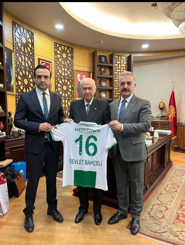 Ağır ceza sonrası Bursaspor’u ziyaret edip “Yanınızdayız” mesajı veren MHP İl Başkanı Cihangir Kalkancı daha sonra MHP Genel Sekreteri ve Bursa Milletvekili İsmet Büyükataman’la birlikte ziyaret ettiği MHP Genel Başkanı Devler Bahçeli’ye Bursaspor forması takdim etti.