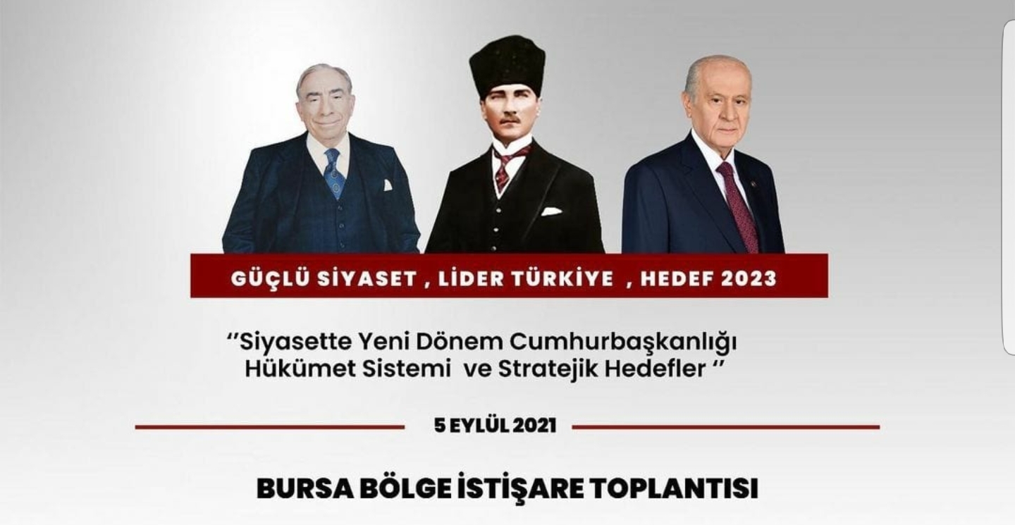 MHP Genel Merkezi’nin düzenlediği ve Bursa, Balıkesir, Bilecik, Çanakkale, Eskişehir, Kütahya, Yalova’nın katılacağı “Siyasette Yeni Dönem Cumhurbaşkanlığı Hükümet Sistemi ve Stratejik Hedefler” konulu toplantı 5 Eylül Pazar günü saat 13.00’te Merinos Osmangazi Salonu’nda.