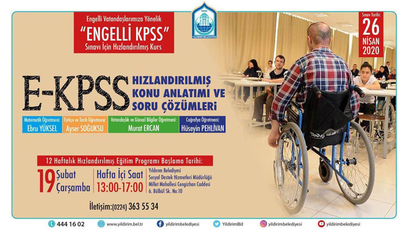 Yıldırım Belediyesi, sosyal sorumluluk projeleri kapsamında kısa ada KPSS olan Kamu Personel Seçme Sınavı’na katılacak engelli vatandaşlar için hızlandırılmış kurs düzenledi.