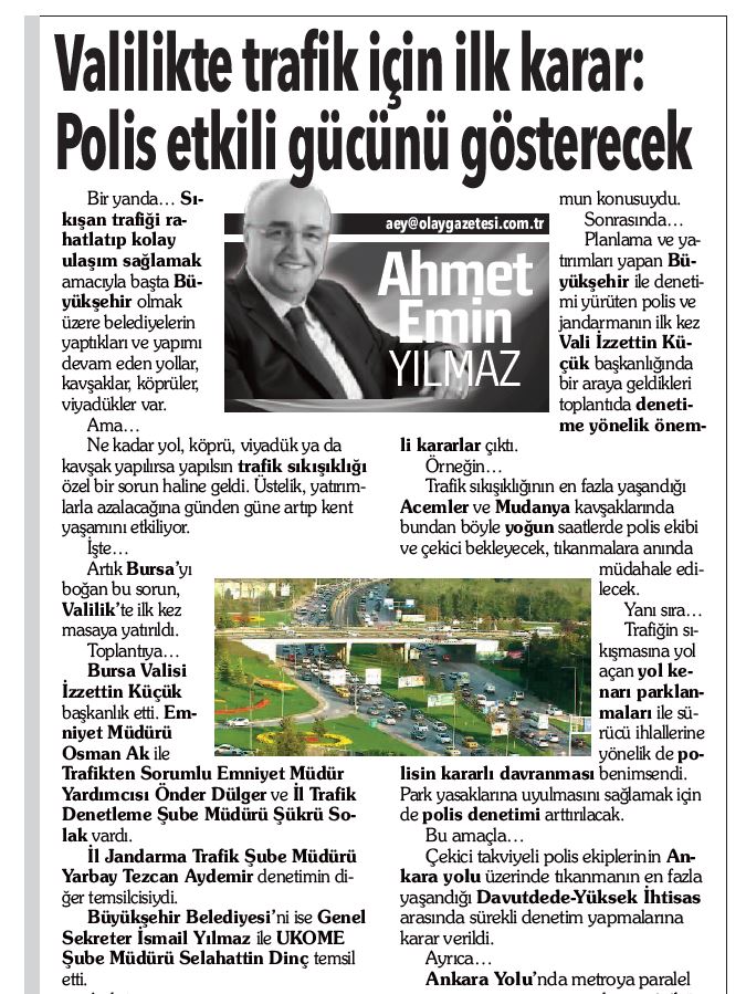 Bursa’nın son dönemde yol vermeyen ve bu nedenle de bunaltan trafiği için bir yandan Büyükşehir Belediyesi yeni yollar, yeni köprülü kavşaklar, yeni viyadükler ve yeni düzenlemeler yaparken, idari anlamda Vali İzzettin Küçük de harekete geçti ve koordinasyonu üstlendi.