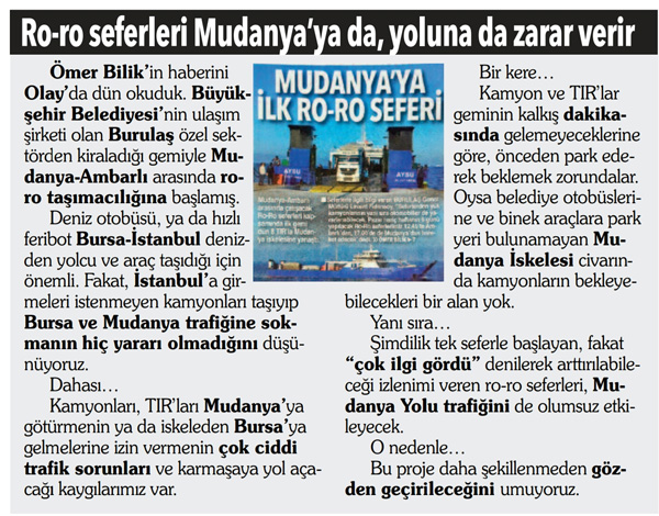Şimdilik tek seferle başlayan, fakat “çok ilgi gördü” denilerek artırılabileceği izlenimi veren ro-ro seferleri, Mudanya Yolu trafiğini de olumsuz etkileyecek.