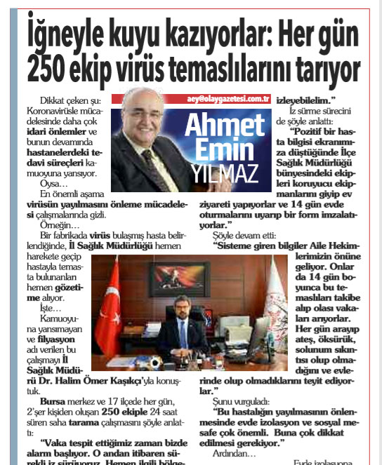 Koronavirüsle mücadelede hastayla temaslı kişilerin takibini esas alan filyasyon uygulamasının Bursa’daki çalışmalarını 11 Nisan Cumartesi günü bu sütunlardan duyurduk.