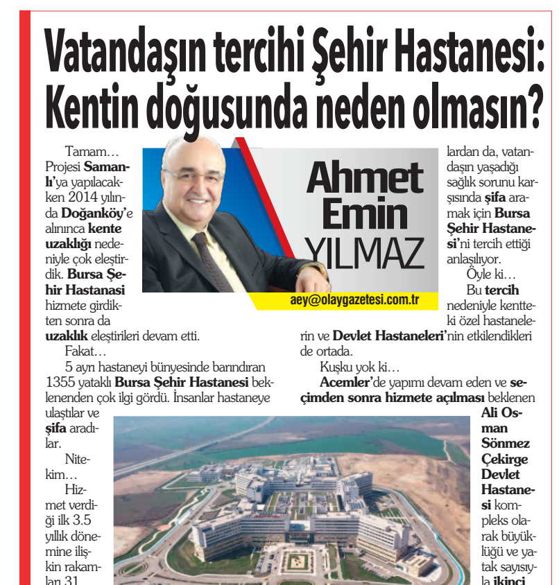 AK Parti İl Başkanı Davut Gürkan’ın “Osmangazi ve Yıldırım’a hitap edecek 1000 yataklı hastane planlandı” açıklamasını ve yeriyle ilgili “Osmangazi’nin kuzeydoğusuyla Yıldırım arasında” sözlerini aktardık.
