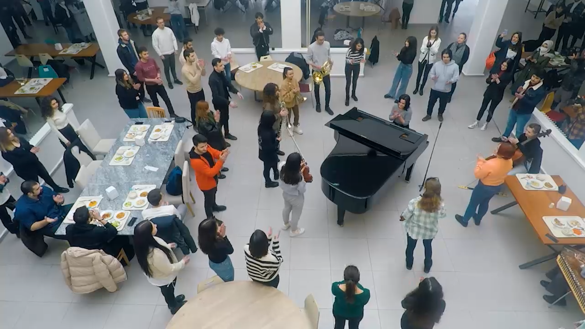 Bir genç kız gelip piyanoyu çalmaya başlıyor. Ona flüt eşlik ediyor. O anda, çevre masalardaki öğrenciler enstrümanlarını çıkarıp tek tek müziğe katılıyorlar.