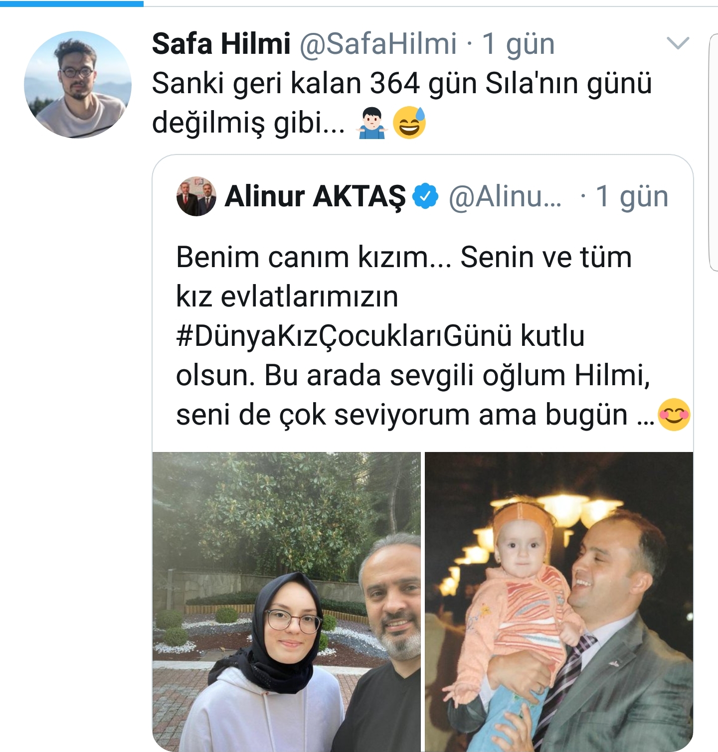 “Canım kızım. Senin ve tüm evlatlarımızın Dünya Kız Çocukları Günü kutlu olsun. Bu arada sevgili oğlum Hilmi, seni de çok seviyorum ama bugün kızlarımızın günü. Alınmaca yok…”
