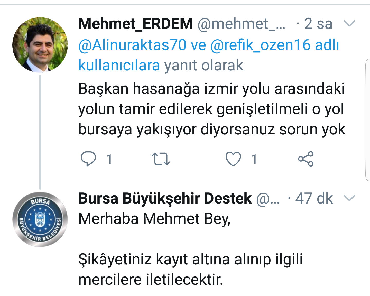 Mehmet Erdem adlı vatandaş Twitter’da dün sabah saat 07.25’te Büyükşehir Belediye Başkanı Alinur Aktaş ve AK Parti Bursa Milletvekili Refik Özen’i etiketleyerek şunu yazdı: