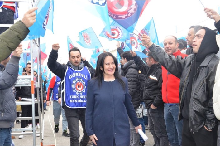 Otomotiv sektörü fabrikalarındaki eylemleri ziyaret eden ve metal iş kolunda ilk kadın sendika başkanı olan Türk Metal Bursa Şubesi Başkanı Selda Tekman’a her terde coşkulu karşılamalar yapılıyor.