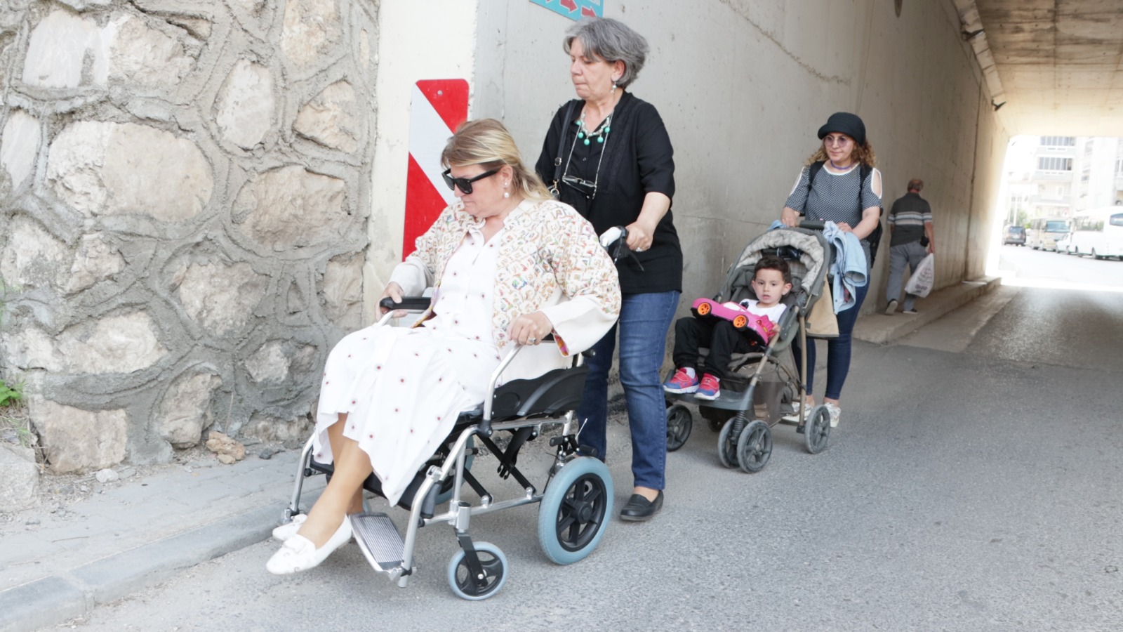 Tekerlekli sandalye ile kaldırımda ilerleyemediği için can güvenliği riski yaşayan engellilerin karşılaştıklarına dikkat çekti.