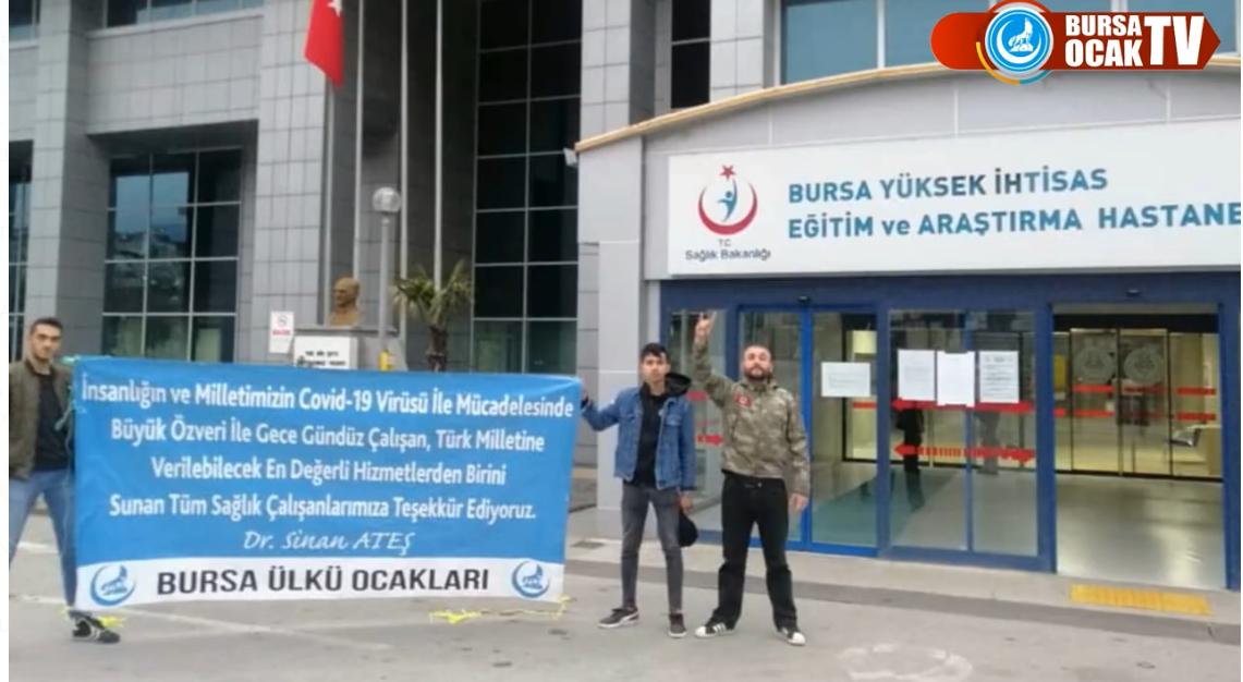Yaşanan tabloya Bursa Ülkü Ocakları Başkanı Cahit Özdemir’den farklı bir destek geldi. Kent merkezindeki hastanelerin önlerine sağlık çalışanlarının yanlarında olduklarını anlatan mesajlar yazılı pankartlar asan Ülkü Ocakları gençleri, “Sizler bizim için görevde, bizler sizin için evdeyiz” dediler.