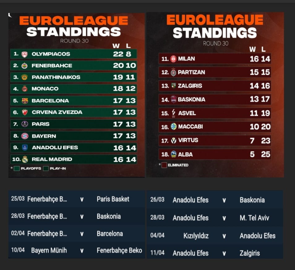 Eurolig’de normal sezon bitiyor. İşler çok kızıştı. Sadece Olimpiyakos’un yeri sağlam gözükürken, son maçta Monaco da kaybeden Fenerbahçe, Olmpiyakos’la olan ikili averaj üstünlüğünden dolayı lider bitirebilme şansını büyük ölçüde yitirdi. Ancak ilk 4 içinde olup saha avantajını almak bu zor sezonda uzunsuz ve sıkıntılı bir numara pozisyonu ile çok başarılı bir sonuç olacak.