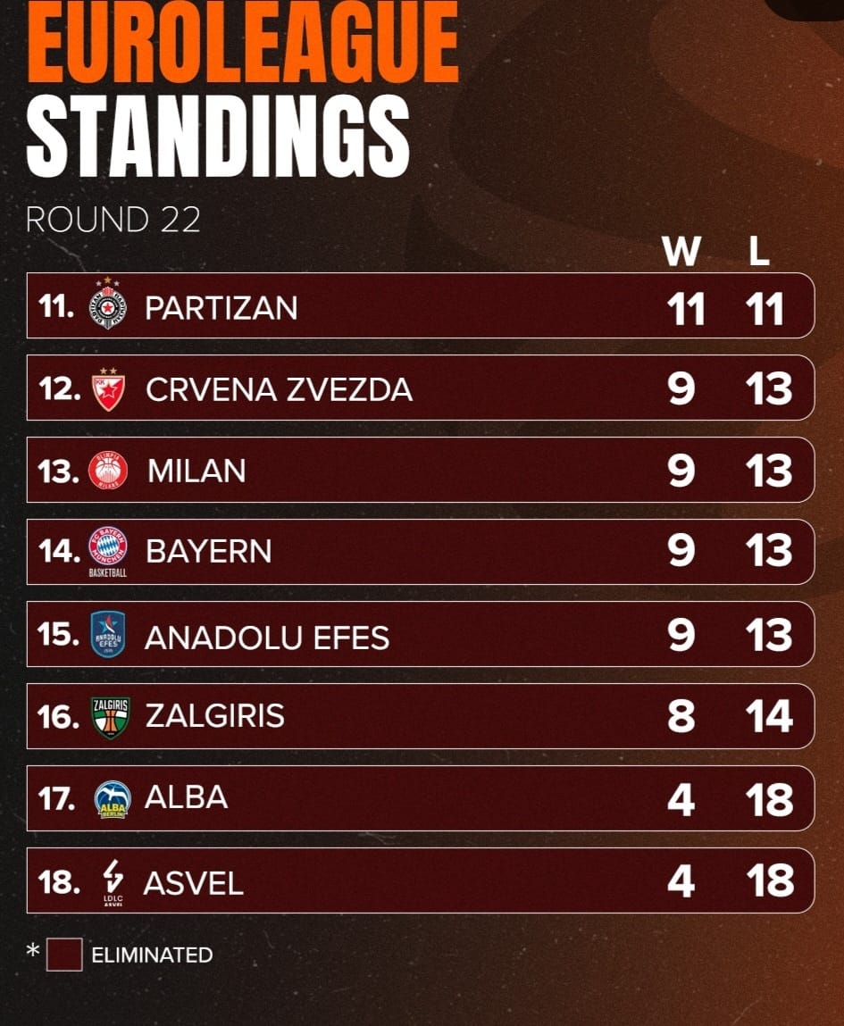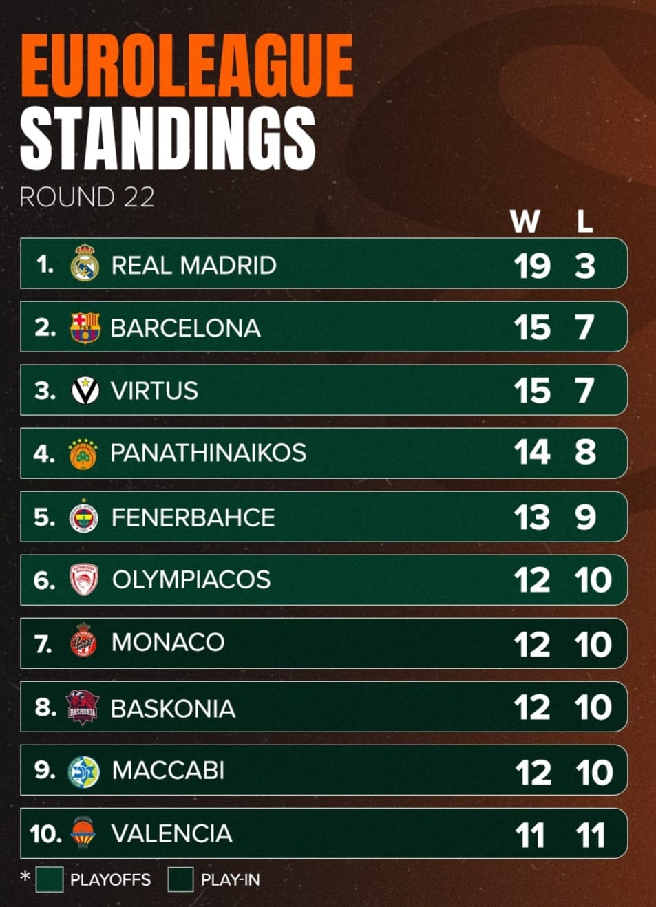 İlk 4 takım oynadıkları basketbol ve kadro yapıları ile öne çıkarken, 5. Fenerbahçe ile 11. Partizan arasındaki takımlar her türlü sıralamaya açık bir savaş içerisinde. Bilindiği gibi bu yıl Play-in oynanacak ve bunun için ilk 10’da bitirmek gerekiyor. Bu savaşı son haftalarda ligde 2. ve 3.’cüyü farklı sonuç ve doğru basketbol ile deviren Anadolu Efes zorlayacak gibi görünüyor. Sabreden derviş misali Koç Erdem Can’ın arkasında duran Efes yönetiminin yaptığının çok doğru bir hamle olduğu ortaya çıktı. Larkin’in müthiş oyunu ve diğer oyuncuların katkıları ile Anadolu Efes üstteki takımların korkulu rüyası haline geldi. Hafta içinde son maçta lider Real Madrid’e sahayı dar eden Monaco ile İstanbul’da oynanacak maç tam bir test olacak.