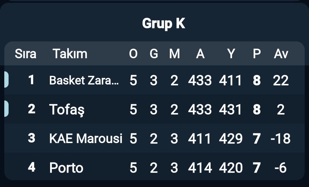 Maçtan önce kazandığımızda ilk 8 garanti demiştik ama gruptaki sonuçlara göre bu maç 7 sayı ile kaybedilse bile çeyrek finali garantilemiş olacaktık, büyük fırsat kaçtı. Oynanacak son maçlar da Zaragoza’da alınacak mağlubiyet de Yunan ekibi Porto da kazansa bile Yunanlıları iki kez yendiğimiz için 2. olacağız. Diğer maçta son haftalarda çıkışı ile favori duruma gelen Porto evinde yenerse ilk maç 8 sayı ile yendiğimiz için Porto ile her şey eşit olacak ve genel averaja bakılacak.