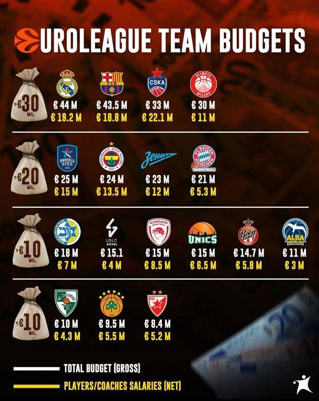 Real Madrid 44 Milyon €, FC Barcelona 43.5 milyon € ’luk bir bütçeyle sezona başladılar. Her iki İspanyol takımı da oyuncu ve antrenör maaşları için yaklaşık 19 milyon € harcıyor. Ancak, İspanyol kulüplerine rağmen, maaş bordrosunda daha büyük bir harcama yapan takım CSKA Moskova; maaşlara yaklaşık 22 Milyon € harcıyor, tüm bütçeleri ise yaklaşık 33 Milyon €. Rusya’daki vergi sistemi, maaşlara daha fazla para harcamalarına yardımcı oluyor.