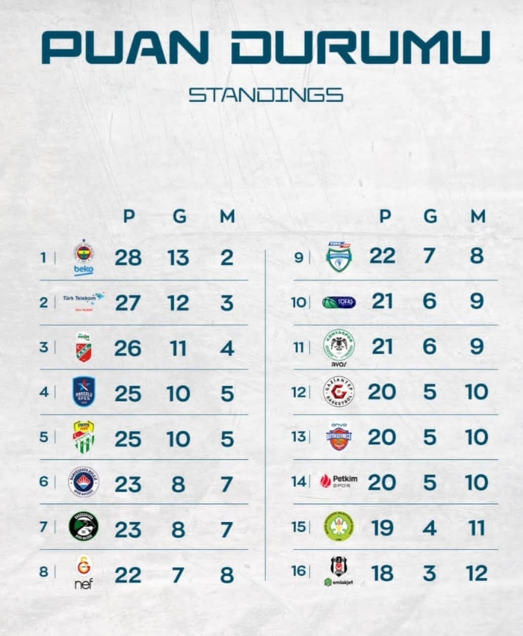 Kadro kalitesine göre maksimum faydayı alan Frutti Extra Bursaspor ise (10/5) beşinci olarak play-off için umut tazeledi ancak kadroya muhakkak yabancı takviyesi yapmak zorunda. Zira maçlar zorlaştıkça kadro derinliği çok önem kazanacak.