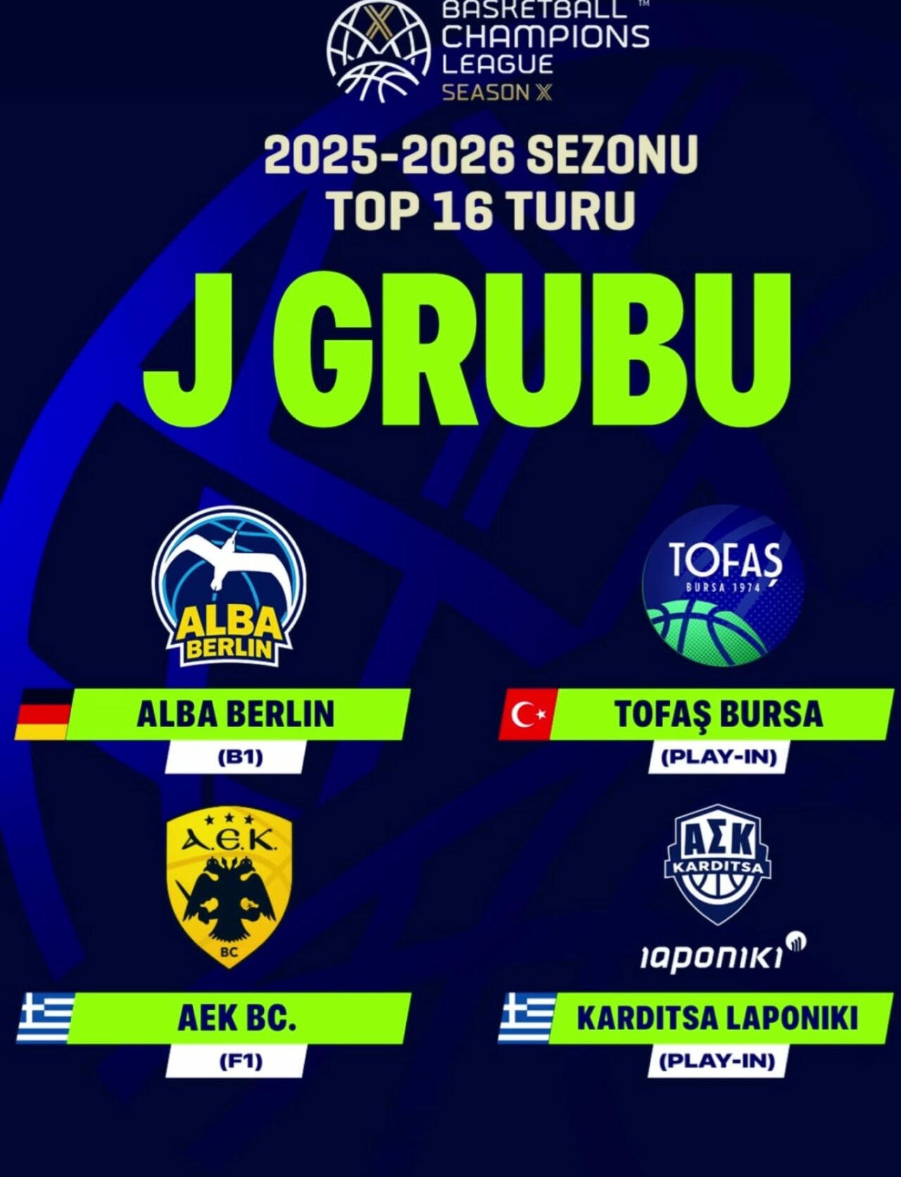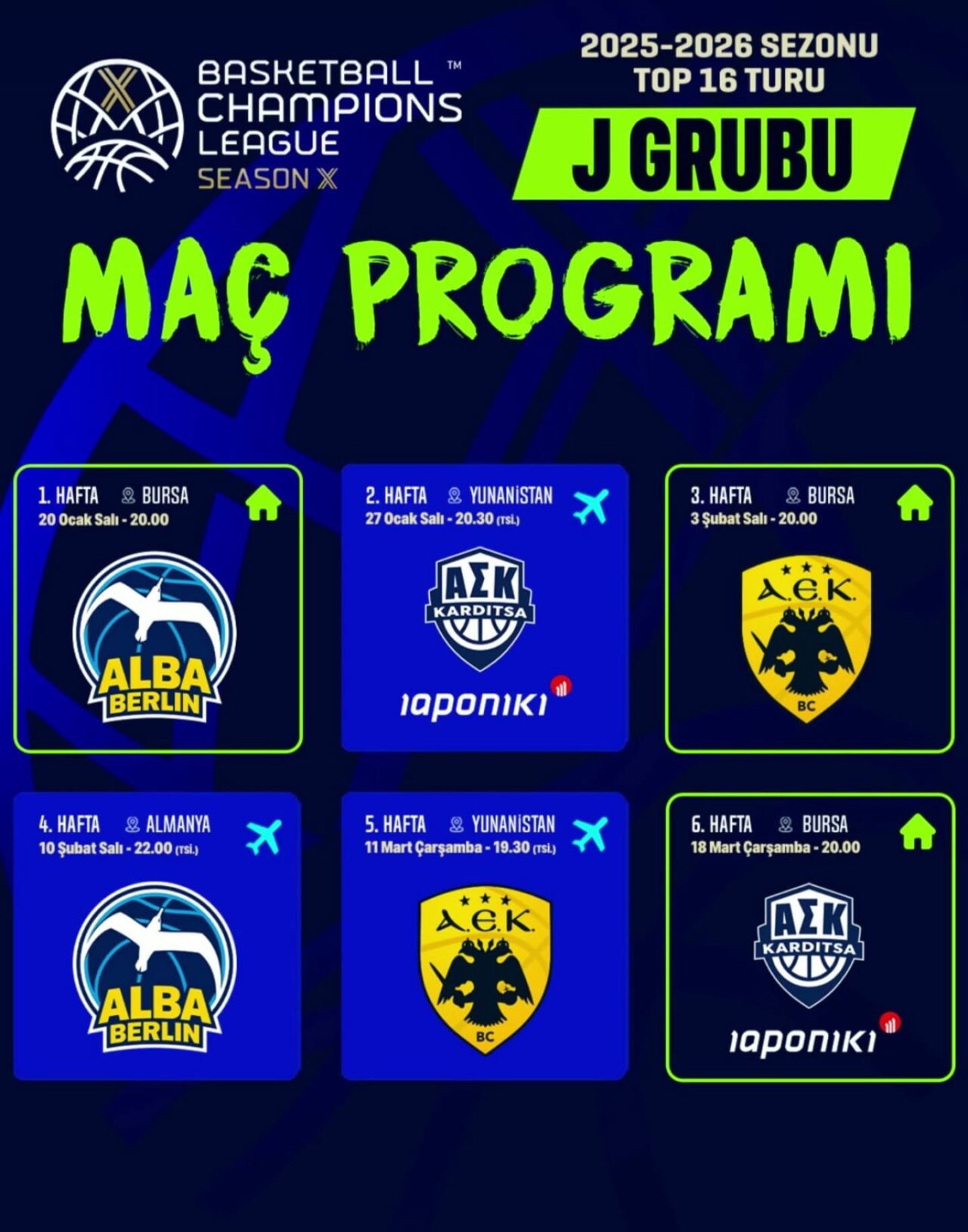 Son 16’da J Grubu’nda; geçen sene Eurolig’de olan Alba Berlin, Yunan ligi 3.’sü AEK ve yine Yunan takımı Karditsa ile oynayarak ilk iki içerisinde yer almaya çalışacağız.