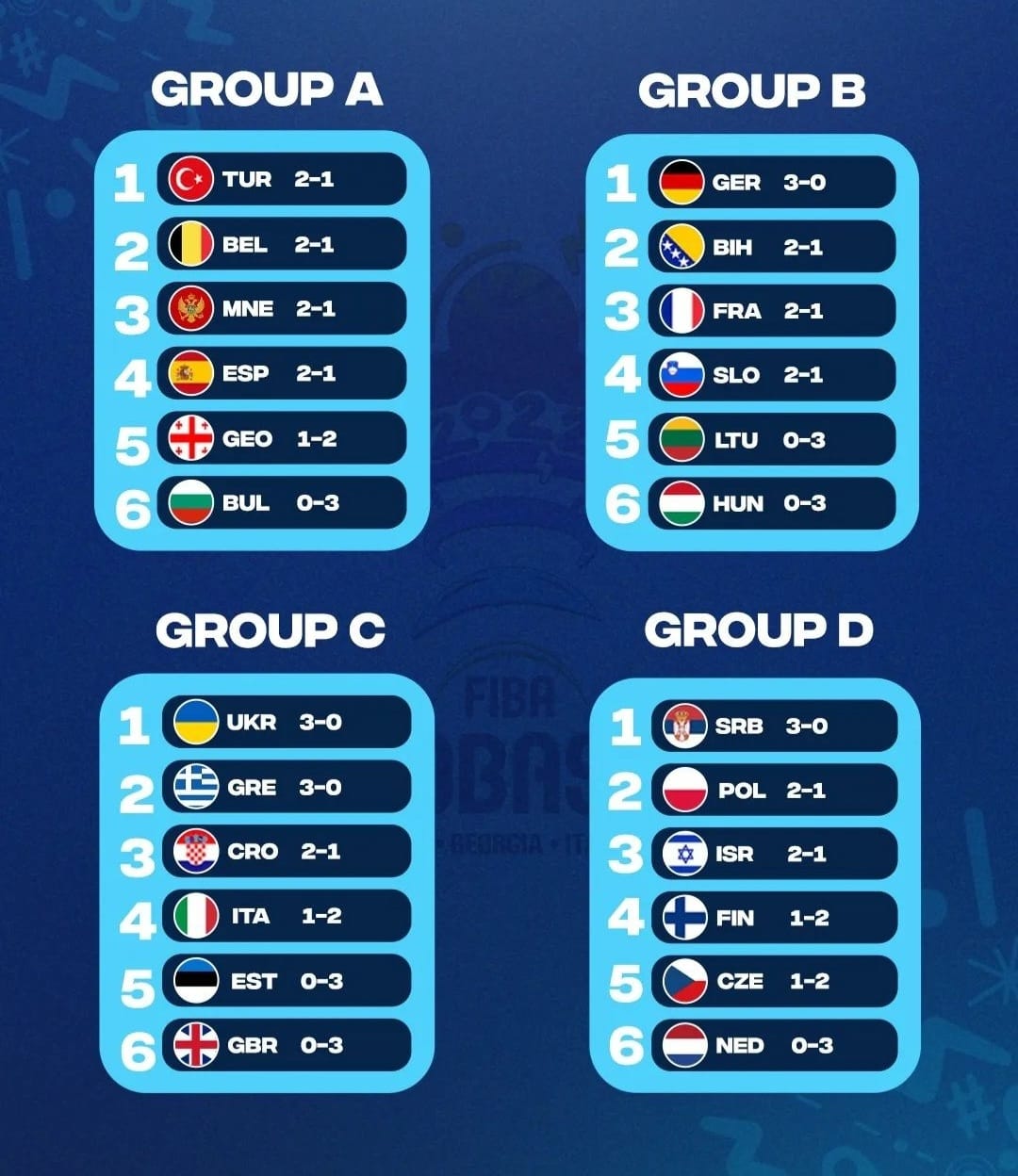 EuroBasket 2022 Tiflis grubunda kendimizden zayıf 3 takım ile oynadık ve Karadağ ile Bulgaristan’ı yenerken, önemli eksikleri olan ev sahibi Gürcistan’a iki uzatma sonunda yenilerek galibiyetle tanışmaları sağladık ve onları da ilk 4 için umutlandırdık.