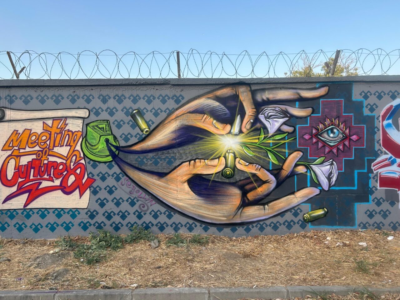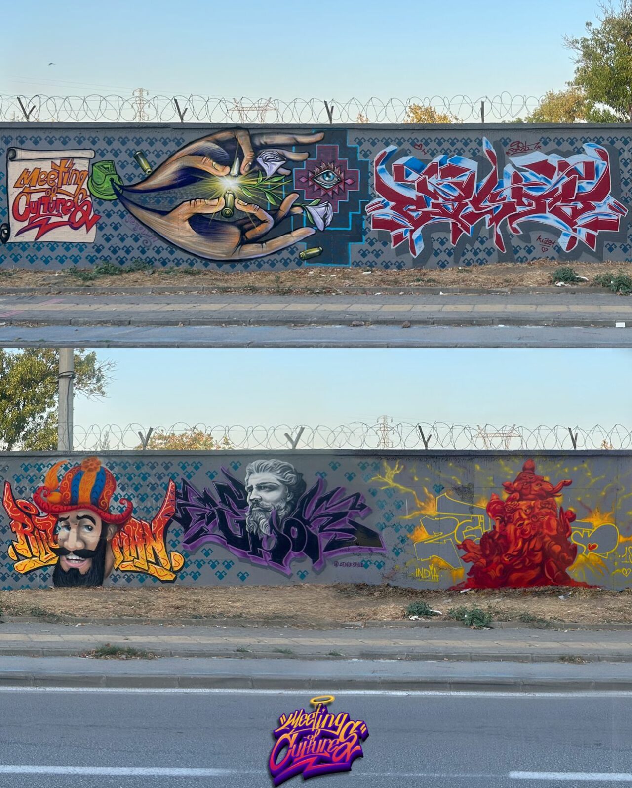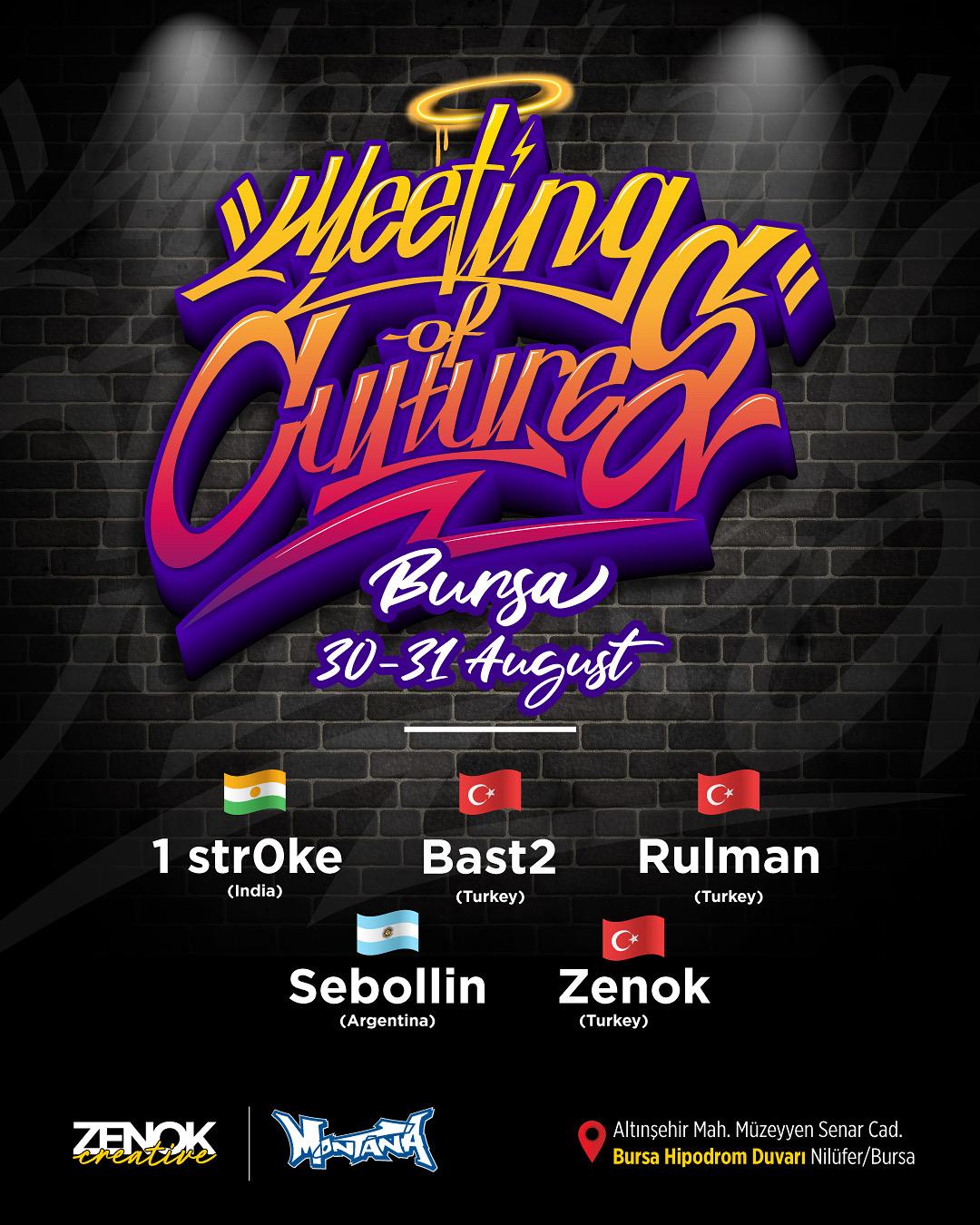 Belediyeden arkadaşlarla konuşup duvar meselesini hallediyoruz. Boyamak için uzun zamandır sözleştiğimiz İstanbul’dan arkadaşım Uğur Bastwo’yu ve Bursalı eski bir graffiti sanatçısı olan Gürkan Zenok’u arayıp etkinliğe davet ediyorum ve böylelikle ortaya Meeting of Cultures çıkmış oluyor.
