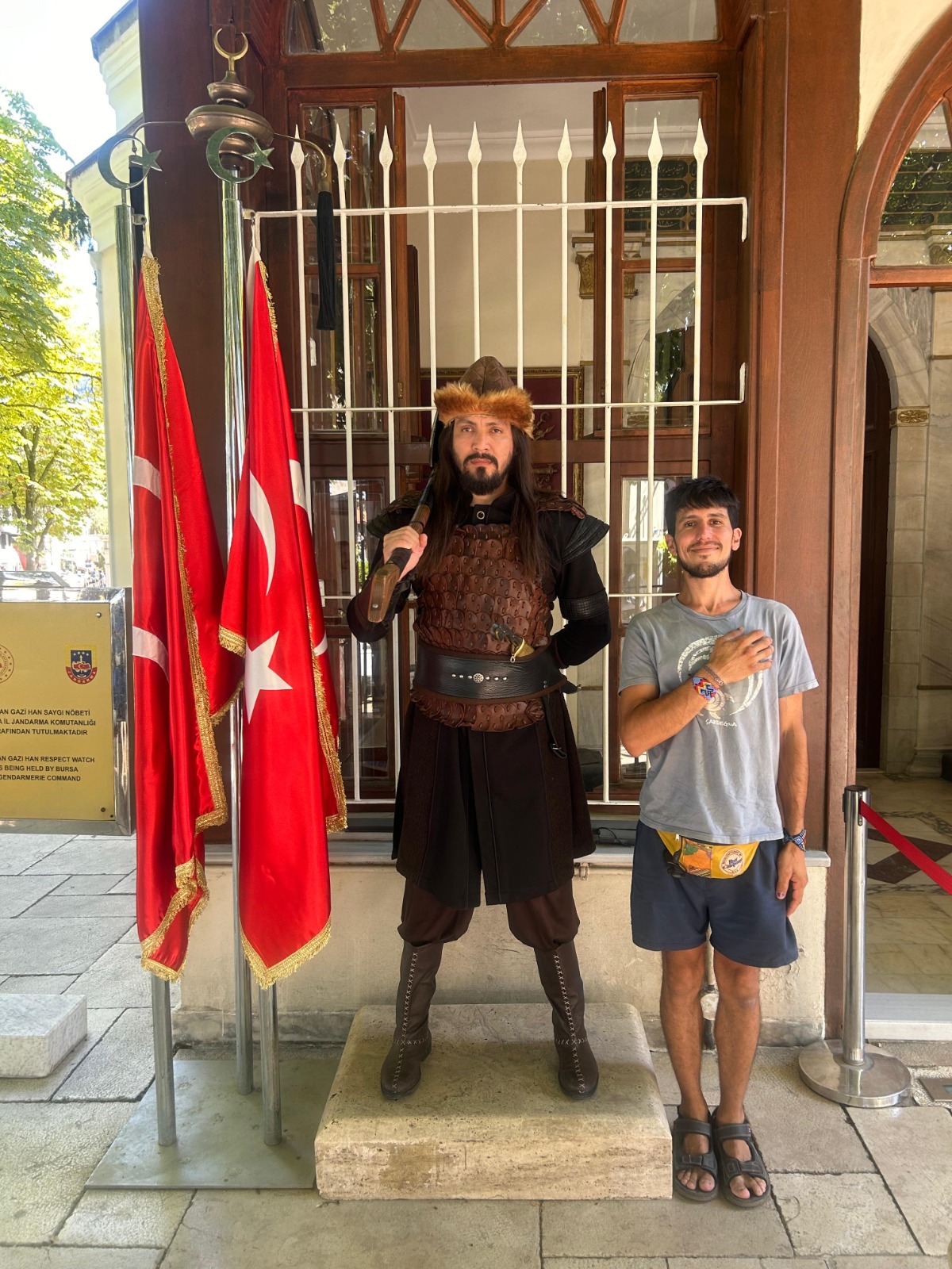 Sonrasında tophaneye çıkıp türbeleri ziyaret ediyoruz. Kapıdaki güvenliğe arkadaşın hikayesinden bahsedip Diriliş Ertuğrul’dan etkilenip Bursa’ya geldiğini anlatıyorum. Böylelikle Osman Gazi’nin türbesinin önünde duran kostümlü askerlerle fotoğraf çekilsin diye güvenlik şeridi çözülüyor.