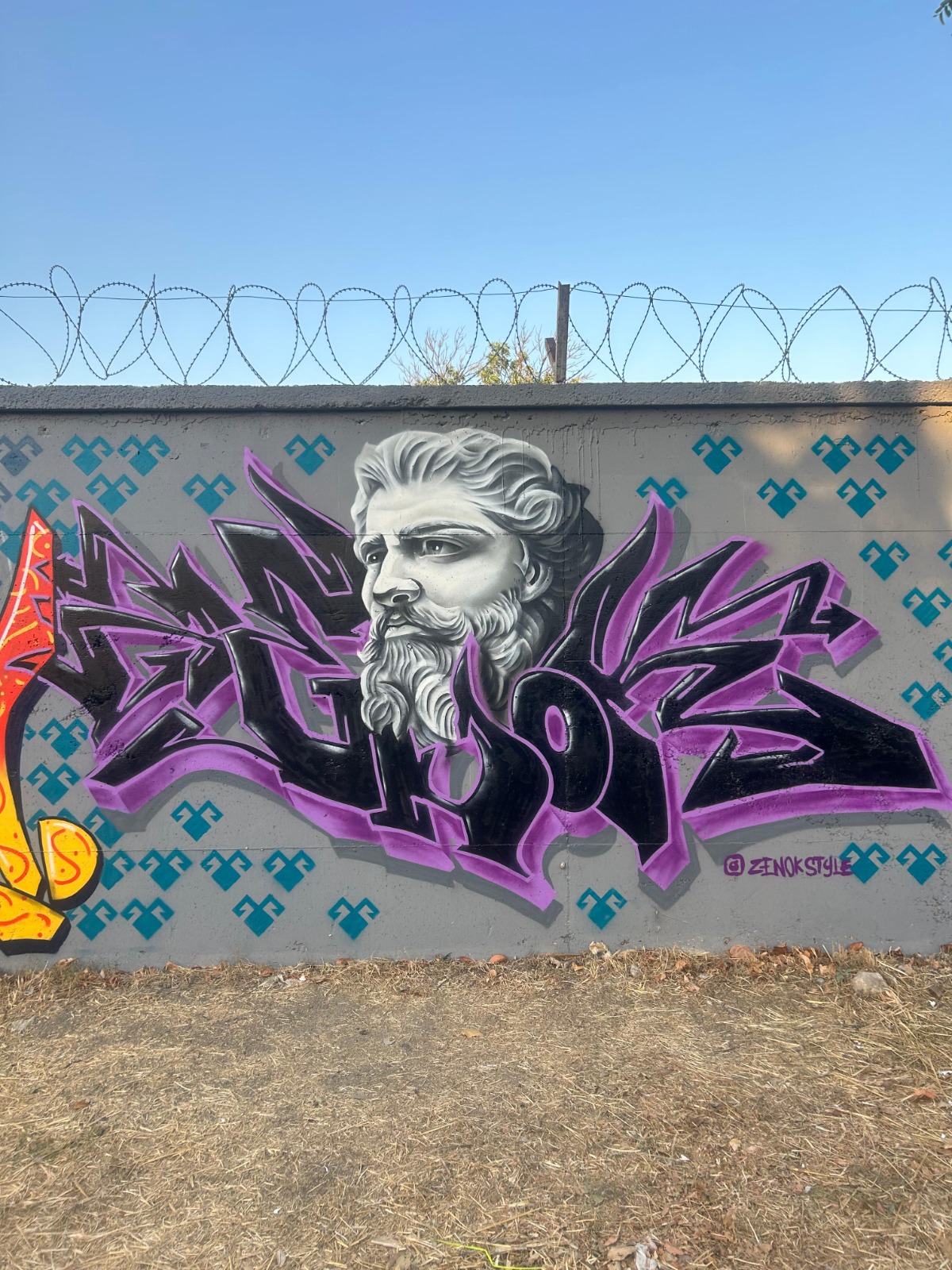 Sebo kendi kültüründe önemli bir yer tutan elleri ve etnik bir deseni çiziyor ve arasına da festival alanında gördüğü lila renkli çiçekten etkilenip birkaç çiçek çiziyor. Gerçek bir sokak sanatçısı! Bursa’dan sonraki durağı, Yunanistan’da başka bir festival olacak. Oradan Arnavutluk ve Belgrad’a geçip yine farklı duvarlar boyayacak. İmrendiğimiz hayatı yaşayan Sebo’yu bırakıp, 1stroke’a geçtiğimizde Hindistan’da bolluk ve bereket tanrısı olan Ganpati’yi çizdiğini görürken, Uğur Bastwo muhteşem stiliyle kendi adını yazıyor ve Gürkan Zenok ise Zeus’u resmediyor.
