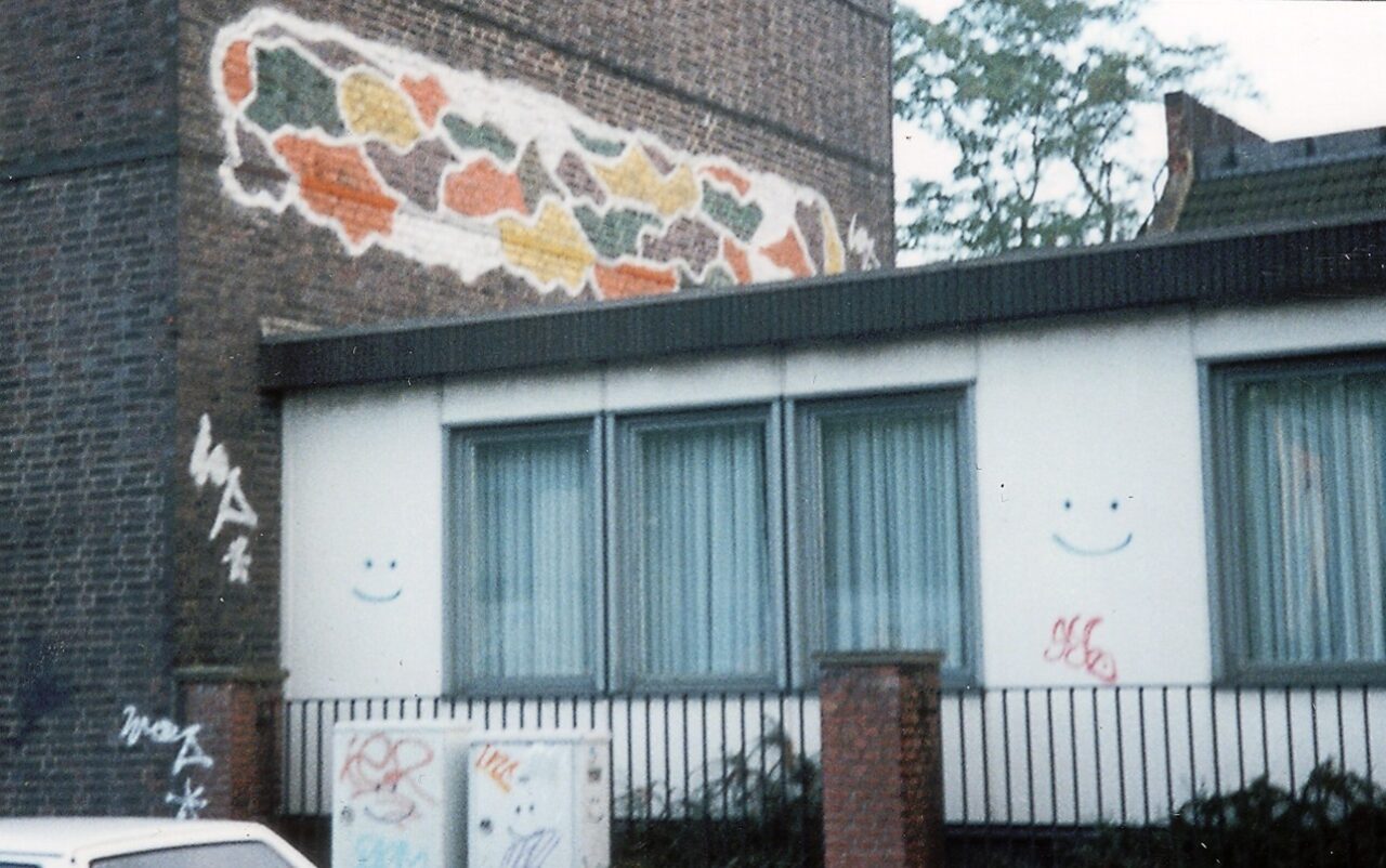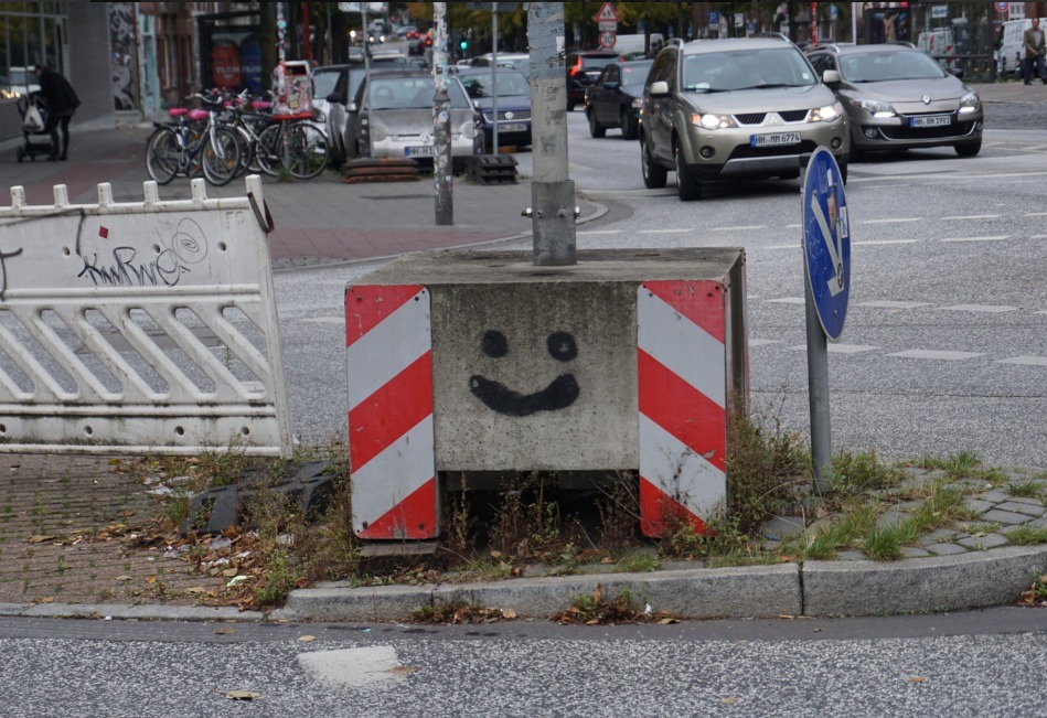 Kendisi sadece çizdiği gülücüklerle değil, yaptığı diğer işleri spiraller ve noktalarla da biliniyor. Sokak sanatının Hamburg’da öncülerinden biri olan OZ şehrin birçok noktasında kendince renkli dokunuşlarda bulunmuş. 1990’da yaptığı bir işi aşağıda görebilirsiniz.