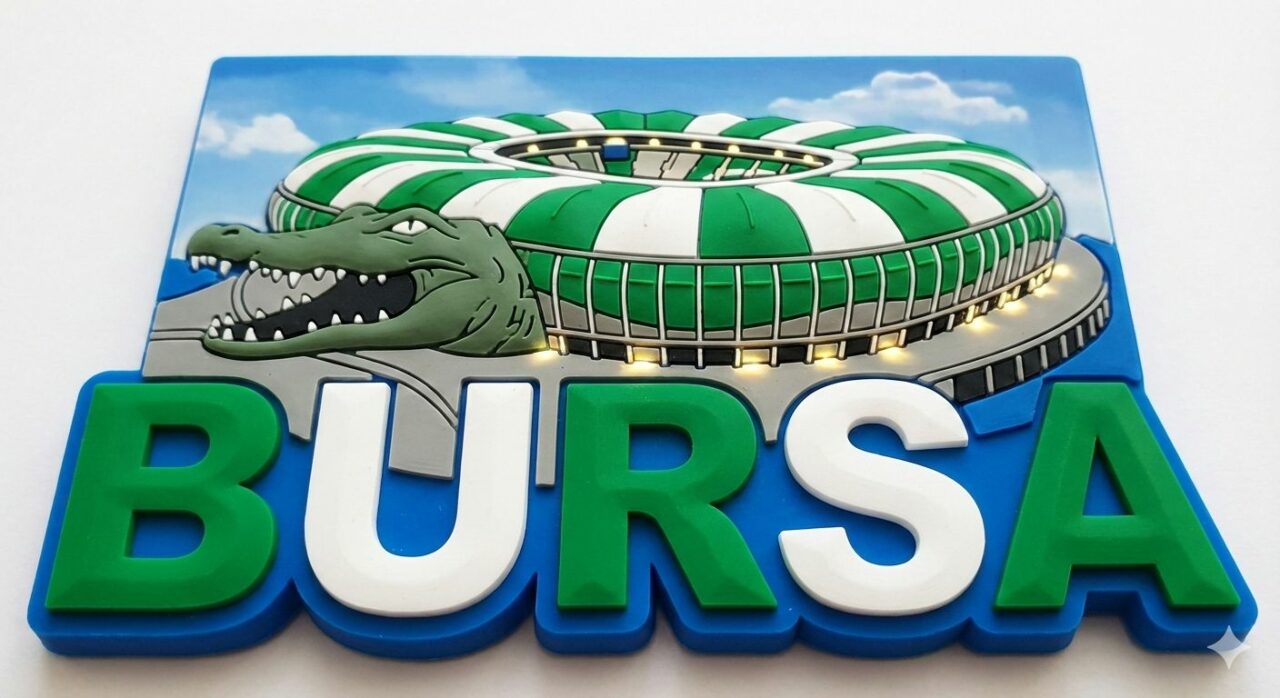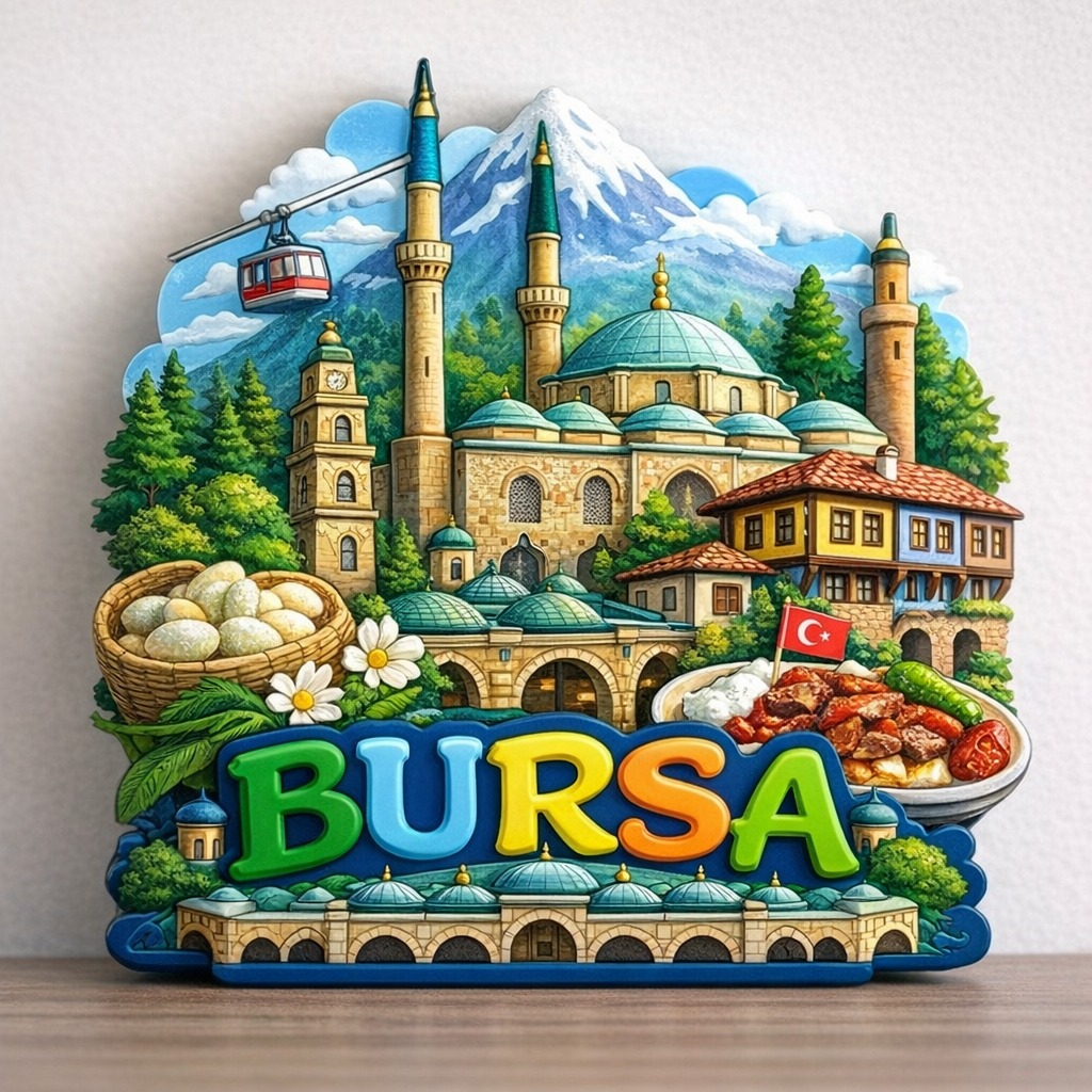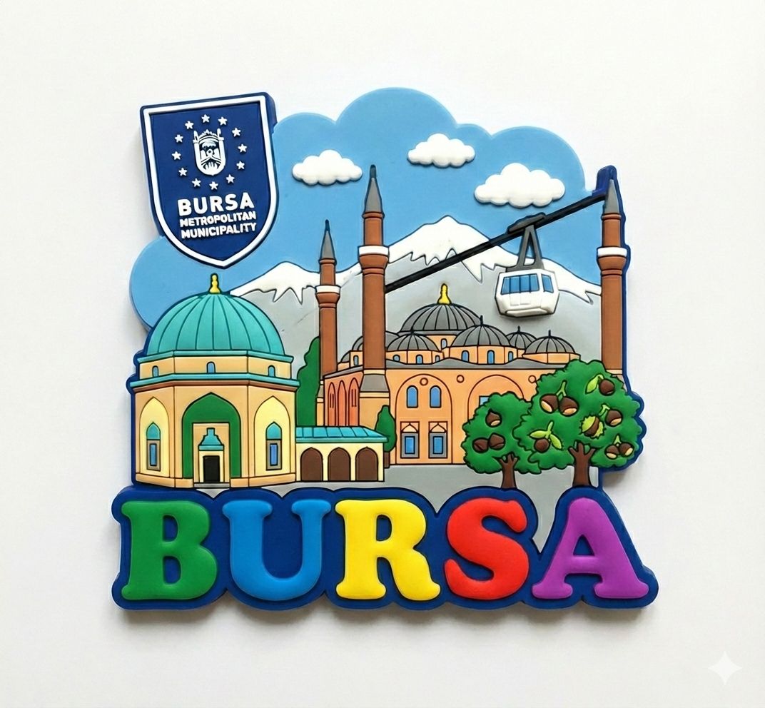 Bu konuyu burada lafta bırakmak istemediğimden, sizlere bazı örnek tasarımlar sunmak istedim. Yapay zeka sağolsun, Bursa için nasıl bir magnet tasarlanabileceğini hızlıca birlikte çalıştık. İşte elde ettiğim sonuçlar: