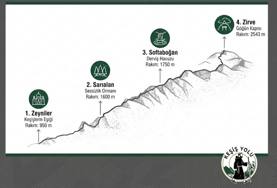 Ardından rota sizi daha yükseğe, suyun sesiyle ruhunuzu dinlendireceğiniz 1750 metredeki Softaboğan’a, o gizli ‘Derviş Havuzu’na götürüyor. Ve final, bulutların üzerine çıktığınız, Marmara’ya tepeden baktığınız 2543 metredeki Zirve, yani Göğün Kapısı.