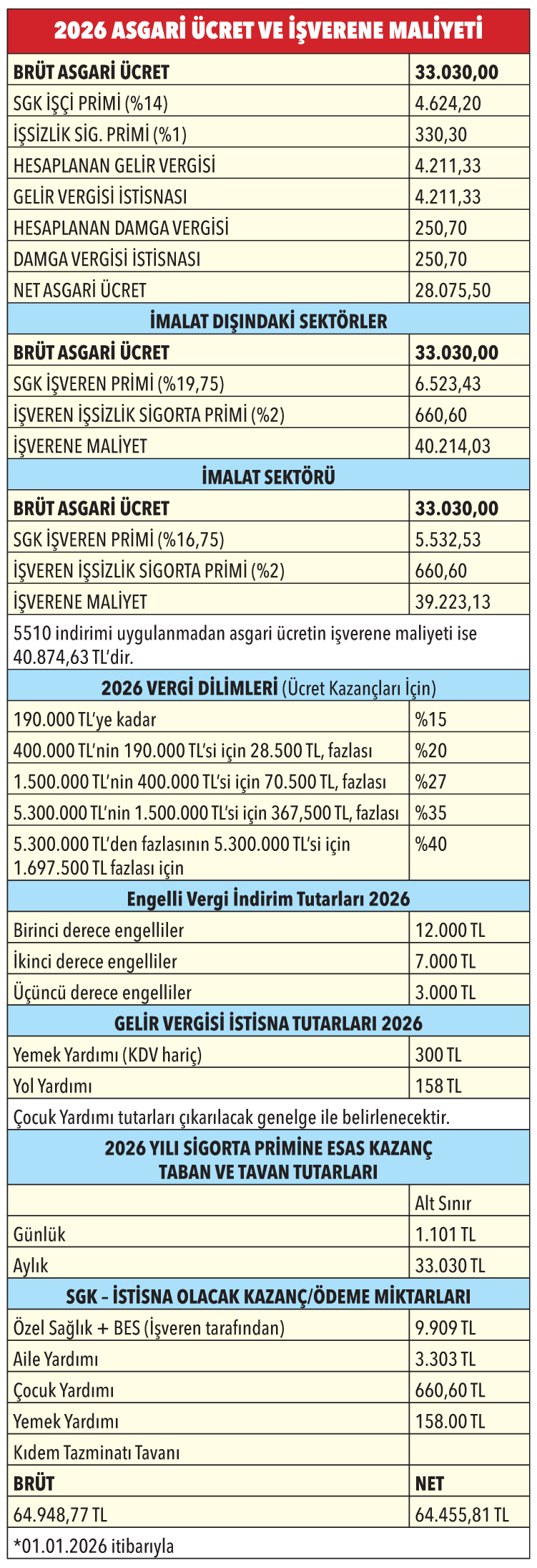 Her yıl işverenler ve çalışanlar açısından merak edilen konuların başında açıklanan asgari ücret ne olacak, asgari ücretin işverene maliyeti ne olacak, sigorta primine esas kazanç tutarları ne olacak, Gelir Vergisi tarifesi ve varsa istisnalar ne olacak soruları geliyor. Tüm bu sorulara cevap niteliğinde olacak veriler Hazine ve Maliye Bakanlığı tarafından yayımlanan 06/01/2026 tarihli Mali ve Sosyal Haklar Genelgesinde ayrıntılı olarak açıklanmış olup okuyucularımıza kolaylık olması açısından tablo halinde aşağıda verilmiştir.