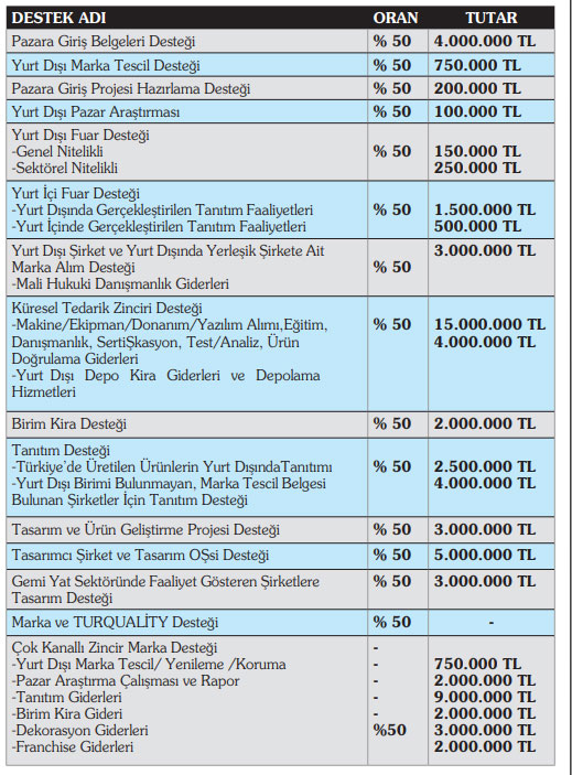 Yapılan son düzenleme çerçevesinde Yararlanılacak destek unsurları, tutar ve oranlarının güncel listesi aşağıdaki gibidir.