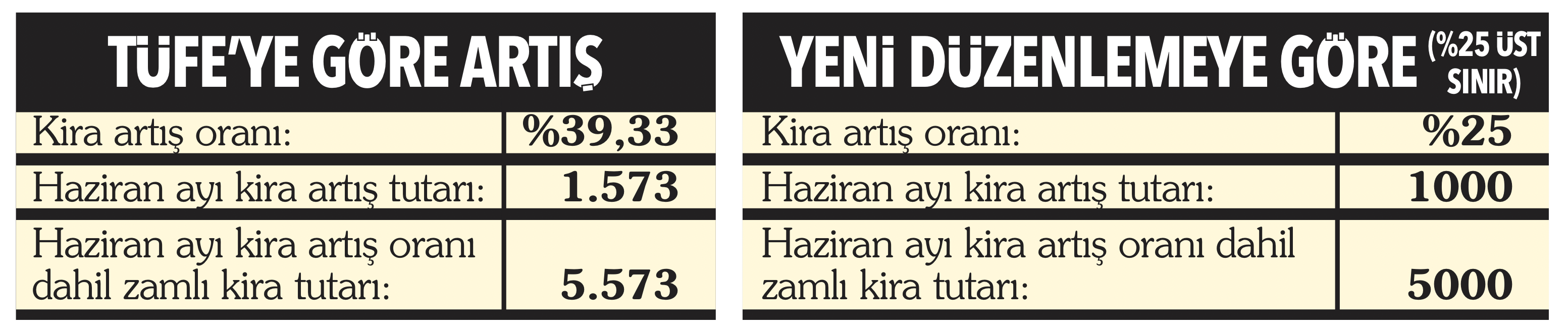 Kiracı kira dönemi gelince yüzde 25 artış yapacak. Fakat kiracı 5. yılını doldurduysa ev sahibi bunun üzerinde bir artış da talep edebilir.