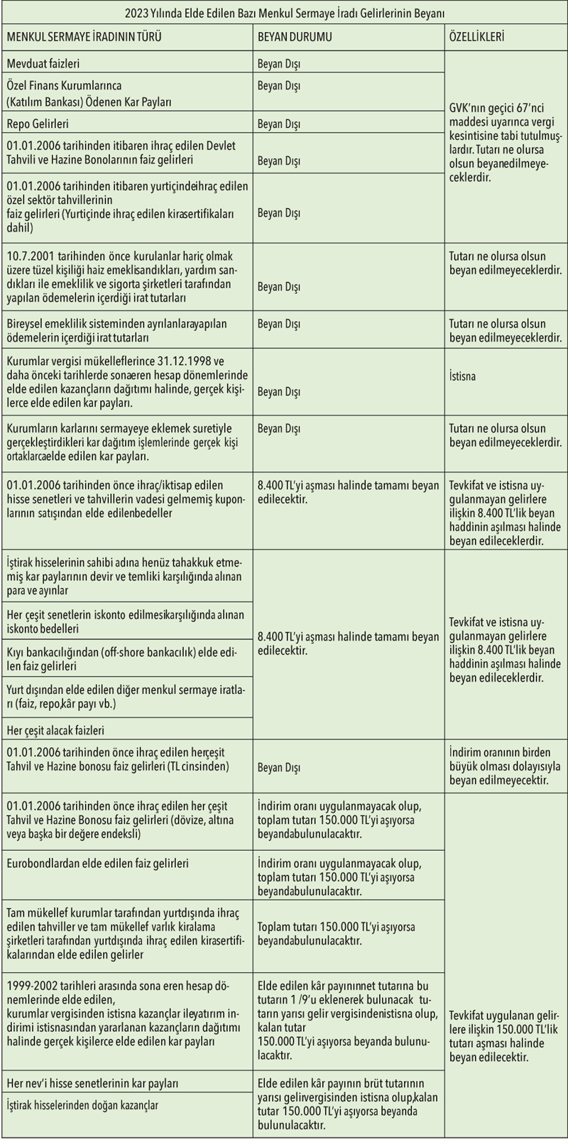 Aynen gayrimenkul sermaye iratları gibi menkul sermaye iratları da esas itibariyle yıllık beyan esasında vergiye tâbi olmakla beraber bunun yaygın istisnaları mevcuttur. Menkul sermaye iratlarının sadece küçük bir kısmı beyan esasında vergiye tabi tutulmaktadır. Aşağıda bu konuda özet bilgi verilmiştir: