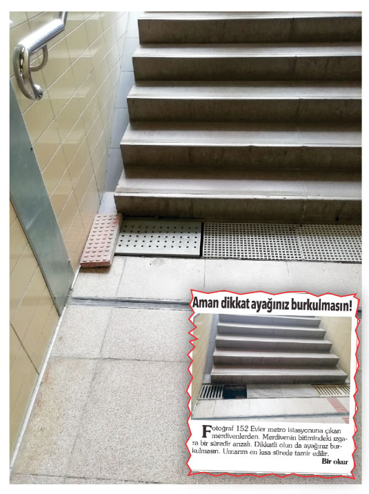 Daha önce birkaç kez bu sütunlarda dile getirdiğim 152 Evler metro istasyonuna çıkan merdiven bitiminde bulunan ızgaradaki sorunun giderildiğini gördüm. İlgilenenlere teşekkür ederim.