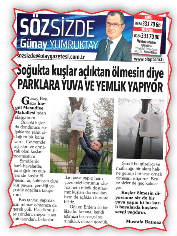 Günay Bey, 26 Ocak 2022 tarihli Söz Sizde köşesinde “Soğukta Kuşlar Açlıktan Ölmesin Diye Parklara Yuva ve Yemlik Yapıyor” başlığıyla yazımı yayımlamıştınız. Sesimiz olup hayırlara, güzel işlere vesile olduğunuz için öncelikle teşekkür ederim.