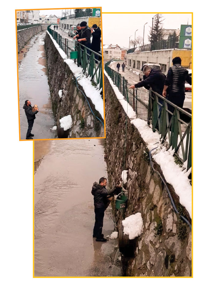 Fotoğraf Yıldırım Selçukbey Caddesi üzerindeki Selçukbey Kanalı’ndan. Anne kedi ve yavrusunu kurtarmak için seferber olan esnaf bu görüntüyü verdi. Aralık Çayevi sahibi Fatih Aşkın’ın kanala sarkıttığı kova ve kanala inen İbrahim Ünaylı kedileri kurtarmaya çalışmışlar. Yaklaşık 2 saat süren bir uğraştan sonra kedilerin kurtarılmasıyla çevre sakinleri rahat bir nefes aldı. Güzel yürekli insanlar gönlünüze sağlık.