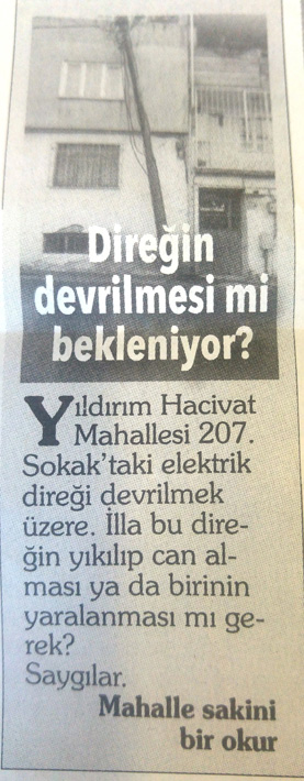 Yıldırım ilçesine bağlı Hacivat Mahallesi 207. Sokak’taki elektrik direğinin bu yılki (2017) yatırım programımızda değiştirilmesi sağlanacaktır.