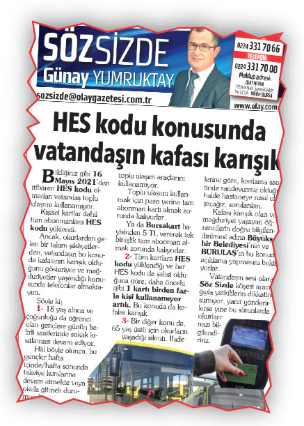 26 Mayıs 2021 tarihli Söz Sizde köşesinde ‘HES Kodu Konusunda Vatandaşın Kafası Karışık’ başlıklı yazımızda konuya değinmiş ve 18 yaş altı öğrencilerin okula/ kurslara gidip gelirken sıkıntı yaşadığını ifade etmiştik. BURULAŞ yaptığı duyuruyla 1 Haziran’dan itibaren 18 yaş altı tüm Bursakart’ların kullanıma açıldığını belirtti. Öğrenciler adına teşekkürler BURULAŞ.