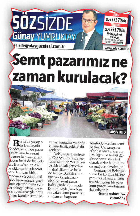 Olay gazetesinin 26 Ocak 2021 tarihli köşenizde yer alan “Semt Pazarımız Ne Zaman Kurulacak?” başlıklı okur yazısı incelenmiştir.