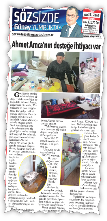 Yazıda adı geçen Ahmet Amca’yı evinde ziyaret etmiş, durumunu yerinde görme imkânı bulmuş ve bu sütunlarda sizlerle paylaşmıştım.