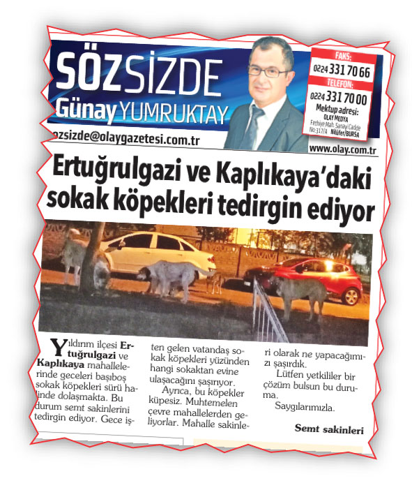 3 Ekim 2020 tarihli gazetenizin Söz Sizde köşesinde yayımlanan “Ertuğrulgazi ve Kaplıkaya’daki Sokak Köpekleri Tedirgin Ediyor” başlıklı okur şikâyeti incelenmiştir.