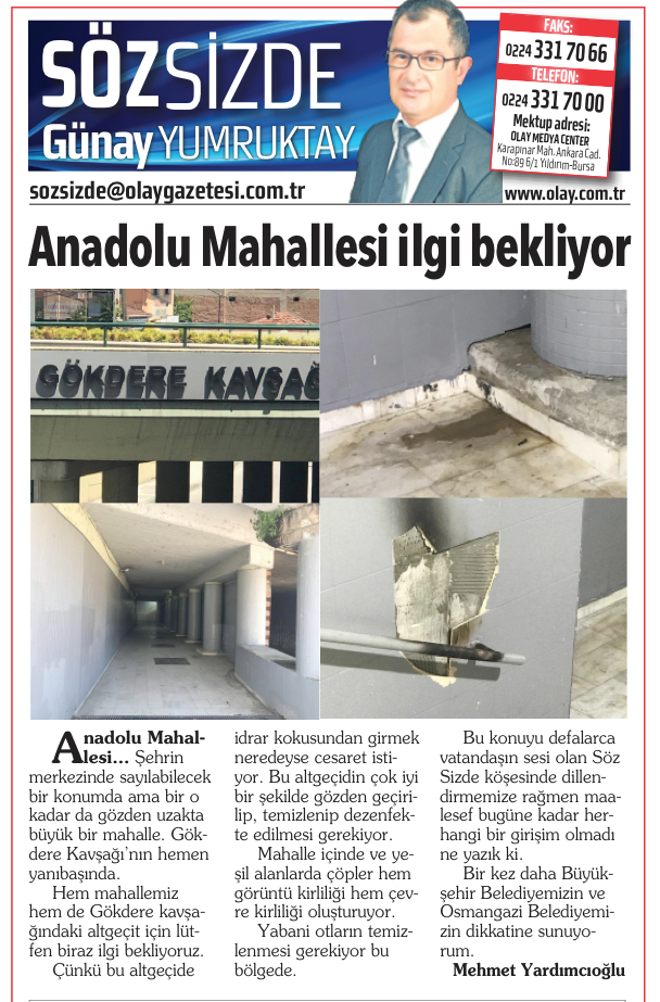 23 Mayıs 2020 tarihli gazetenizin Söz Sizde köşesinde yayımlanan “Anadolu Mahallesi İlgi Bekliyor” başlıklı okur şikâyeti incelenmiştir.