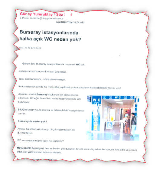Günay Bey, 26 Aralık 2019 tarihinde Olay gazetesindeki köşenizde isminin açıklanmasını istemeyen duyarlı Bursalı bir vatandaşımızın “Bursaray İstasyonlarında Halka Açık WC Neden Yok” başlıklı çok hassas ve son derece önemli bir konuya köşenizde yer verdiğiniz için sizi kutluyor ve teşekkür ediyorum.