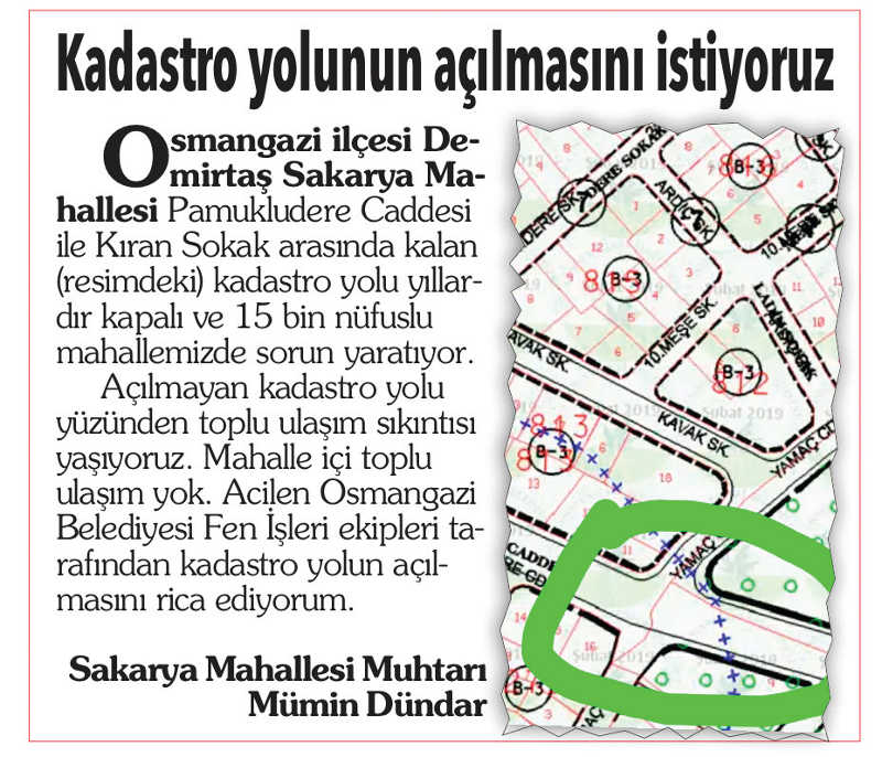 Sayın Günay Yumruktay, Olay gazetesinin 18 Eylül 2019 tarihli Söz Sizde köşesinde ‘Kadastro Yolunun Açılmasını İstiyoruz’ başlıklı bir şikâyete yer verilmiştir.