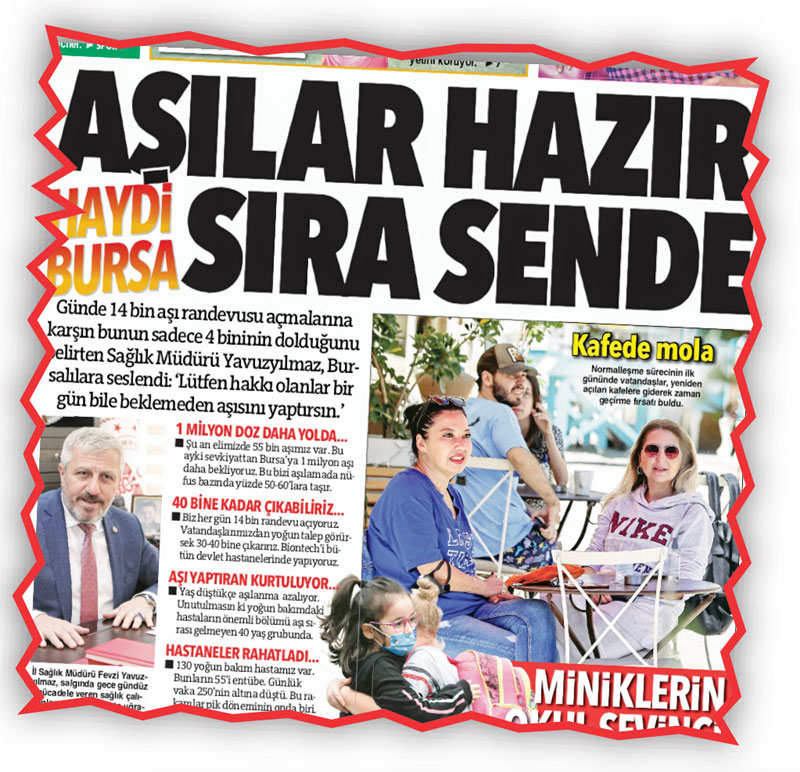 2 Haziran 2021 tarihli Olay gazetesinin manşetten verdiği haberde İl Sağlık Müdürü Sayın Fevzi Yavuzyılmaz ‘Aşı Hazır Sıra Sende’ diyordu. Ve haberin devamında, günde 14 bin aşı randevusu açmalarına karşın bunun sadece 4 bininin dolduğunu belirtip, ‘Lütfen hakkı olanlar bir gün bile beklemeden aşısını yaptırsın’ diye ifade etmiş.